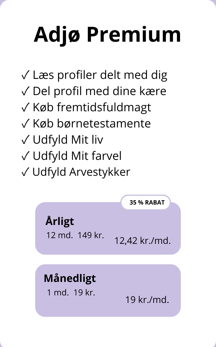 Adjø er en online platform, som medvirker til at sikre, at dit sidste farvel bliver et godt farvel! Og hvor du kan fortælle din historie, som dine kære kan vende tilbage til.